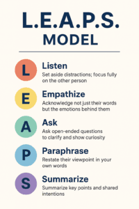 When conflict arises, one of the most effective ways to turn tension into understanding is through the L.E.A.P.S. model, a simple, intentional approach to communication that centers connection. It starts with Listen: set aside distractions, quiet your inner rebuttal, and focus fully on what the other person is saying. Then Empathize, acknowledging not just their words but the emotions behind them. “I can see this has been really frustrating” can go a long way. Next, Ask open-ended questions to clarify meaning and show curiosity rather than judgment. Paraphrase what you’ve heard in your own words to check understanding and demonstrate that you’re truly engaged. Finally, summarize the key points and shared intentions, creating a foundation for moving forward together.